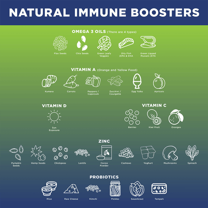 Omega 3 oils, Vitamins A, C, & D, Probiotics, Zinc and Echinacea are great for boosting your immune system.